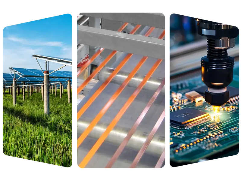 • 太陽光発電分野: コンポーネントが効率的に電気を伝導できるようにする太陽光発電溶接リボンとバスバーの大量生産。